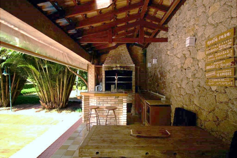 - ANEXO GOURMET integrado à piscina com parede em pedra, churrasqueira, forno de pizza de tijolos, bancadas, balcão e bar.