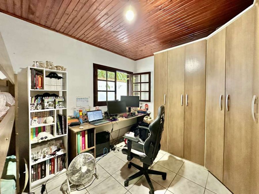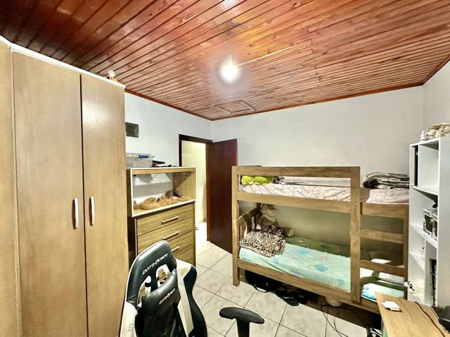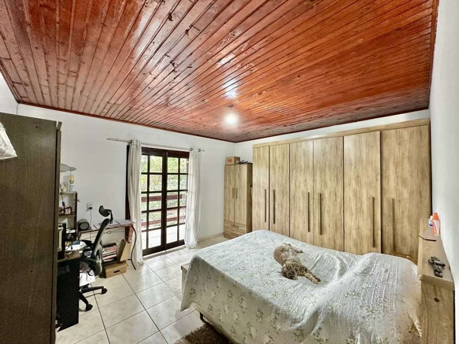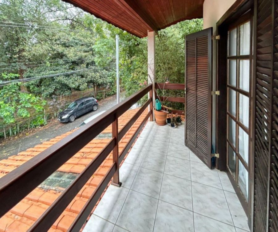 2 dormitórios amplos e 1 banheiro no pavimento superior, um deles com varanda e vista para área verde.
