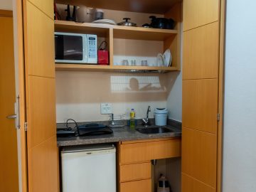 Mobiliado e equipado: sofá, mesa inteligente, cozinha americana equipada com micro-ondas, frigobar, cafeteira, armários planejados - pronto para morar ou alugar imediatamente.