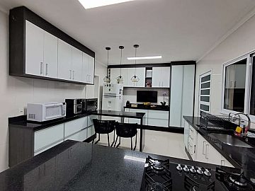 - Cozinha aberta para a sala, com bancada em granito preto São Gabriel, com muitos armários planejados.