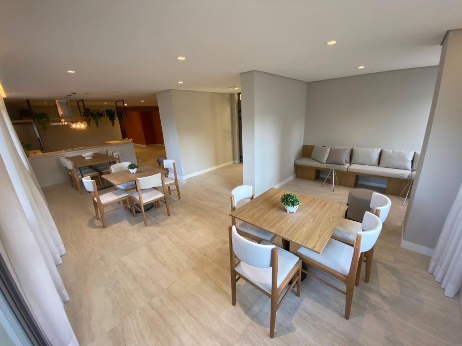 O imóvel, pronto para morar, possui uma área privativa de 79 m² com uma planta inteligente e bem distribuída. A unidade conta com três dormitórios, sendo uma suíte, e dois banheiros sociais. A área social é composta por duas salas integradas que se conectam a uma varanda com vista panorâmica, proporcionando excelente iluminação natural e ventilação. A cozinha em estilo americano otimiza o espaço, complementada por sistema de água quente e infraestrutura para internet banda larga. O imóvel dispõe de uma vaga de garagem coberta.